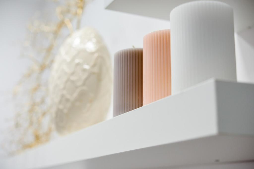 Koralle bringt Energie, Salbeigrün beruhigt, Kreideweiß weitet. Streiche eine schmale Wand in Koralle, wähle salbeigrüne Textilien und halte Decke sowie hohe Sockelleisten kreideweiß. So entsteht rhythmische Frische, ohne dass der Raum seine Leichtigkeit verliert.